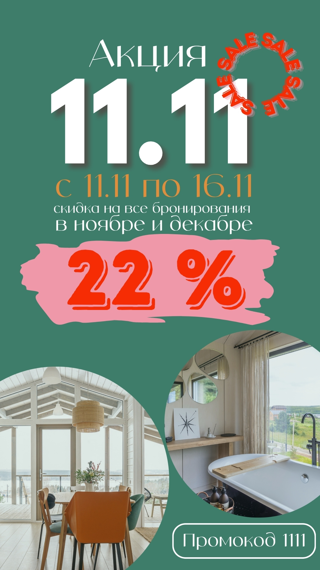 C 11.11-16.11 акция на все бронирования в ноябре и декабре-скидка 22%. Таких скидок мы еще никогда не делали!